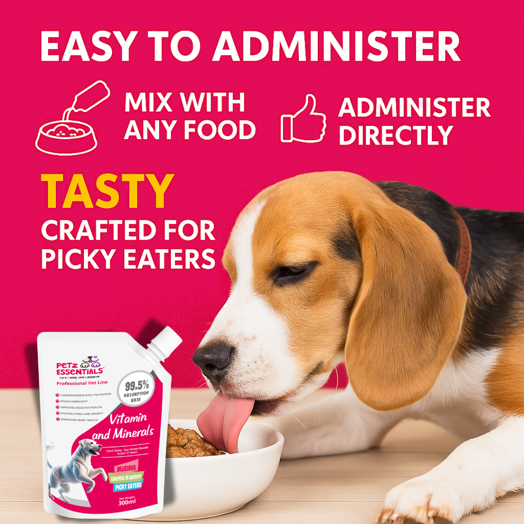 Petz Essentials Vitamin & Minerals – 300ml Oral Paste is a daily multivitamin supplement crafted to meet the full spectrum of nutritional needs for dogs across all life stages. Whether your dog is growing, recovering, or just needs a daily health boost, this oral paste delivers essential vitamins (A, D3, E, C, B12, Biotin), minerals (Zinc, Iron, Calcium, Phosphorus, Magnesium), and antioxidants that help improve immunity, bone strength, digestion, and vitality.